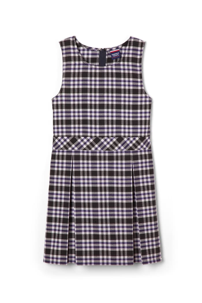 Nothing says "back to school" like this jumper dress in timeless plaid with front pleats, ready to pair with a Peter Pan collar and ballet flats (or a t-shirt and canvas sneakers).